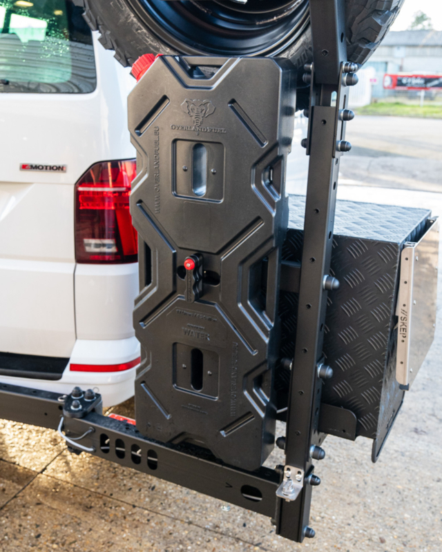 Als u uw jerrycan met vlakke bodem aan de uitrustingsdrager wilt bevestigen, hebt u een Overland-houder voor jerrycans met vlakke bodem nodig.