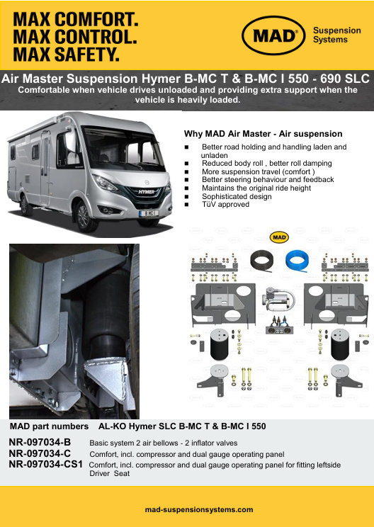 Artikelnummer: NR-197034-CS1Deze innovatieve hulpluchtveerset is ontwikkeld voor de nieuwe generatie HYMER campers, op basis van een Mercedes-Benz Sprinter. De set wordt netjes weggewerkt, afgestemd op de beperkte inbouwruimte. U geniet zo van een zorgeloze en comfortabele reis! |